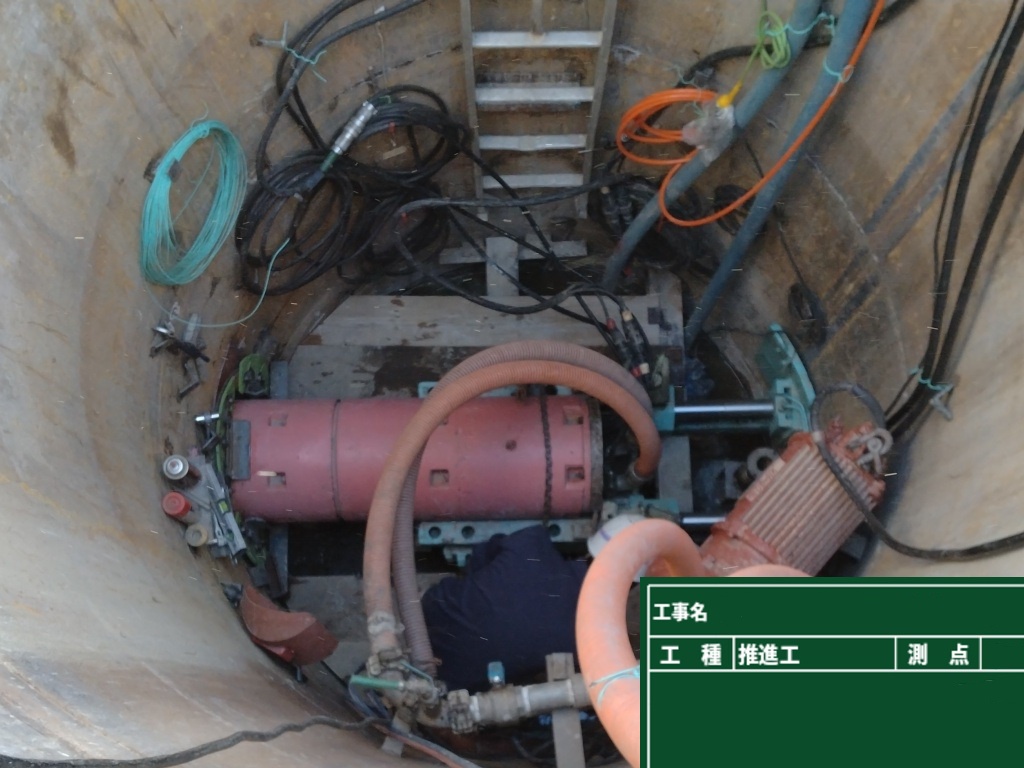 埋設管路の始点となる発進⽴坑から地中を掘り進む掘進機に、管路となる推進管を後続に接続しつつ、発進⽴坑から油圧ジャッキにて推し進めて管路を築造します。